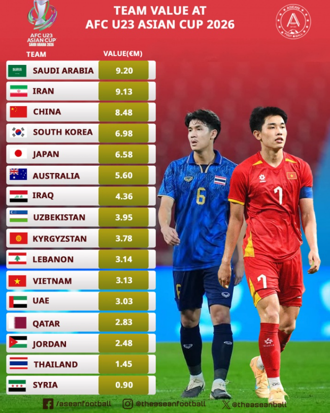 直播吧01月13日讯 U23亚洲杯已有两个小组结束全部比赛。本届赛事总身价排名前两位的沙特队与伊朗队均已被淘汰出局,而出线形势良好的中国U23队则以848万欧元的总身价位列所有参赛球队第三。 U2